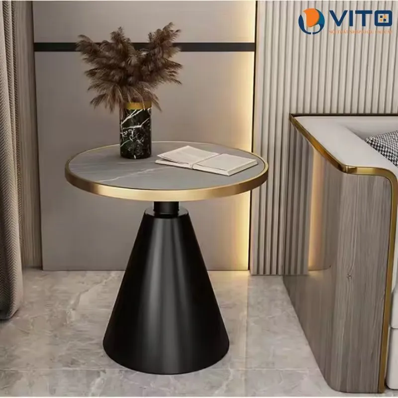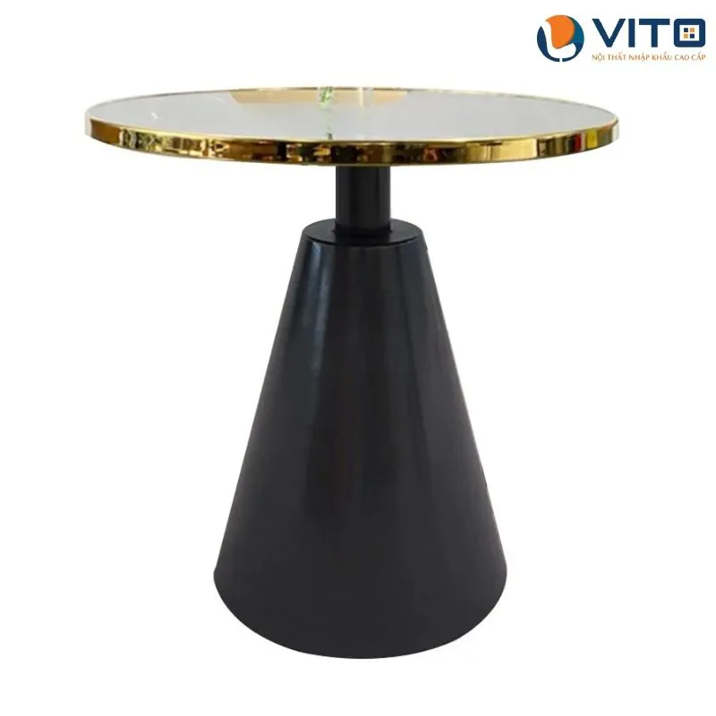 Ngay từ cái nhìn đầu tiên, Bàn cafe mặt đá Vito BCF-HK10 tạo được ấn tượng mạnh mẽ nhờ vẻ ngoài thời thượng, thanh lịch. Mặt bàn tròn được chế tác từ đá marble cao cấp, bề mặt được mài bóng tỉ mỉ, kết hợp với đường viền mạ vàng ánh kim chạy quanh chu vi bàn, tạo nên cảm giác sang trọng và cuốn hút. Những đường vân đá nhẹ nhàng, tự nhiên giúp chiếc bàn nổi bật mà không quá phô trương, phù hợp với cả phong cách nội thất tối giản, hiện đại lẫn phong cách vintage đang được ưa chuộng. Màu trắng chủ đạo của đá marble kết hợp với viền vàng không chỉ tạo điểm nhấn thị giác mà còn góp phần làm sáng không gian, khiến góc ngồi trở nên nhẹ nhàng, thư thái và dễ chịu hơn.