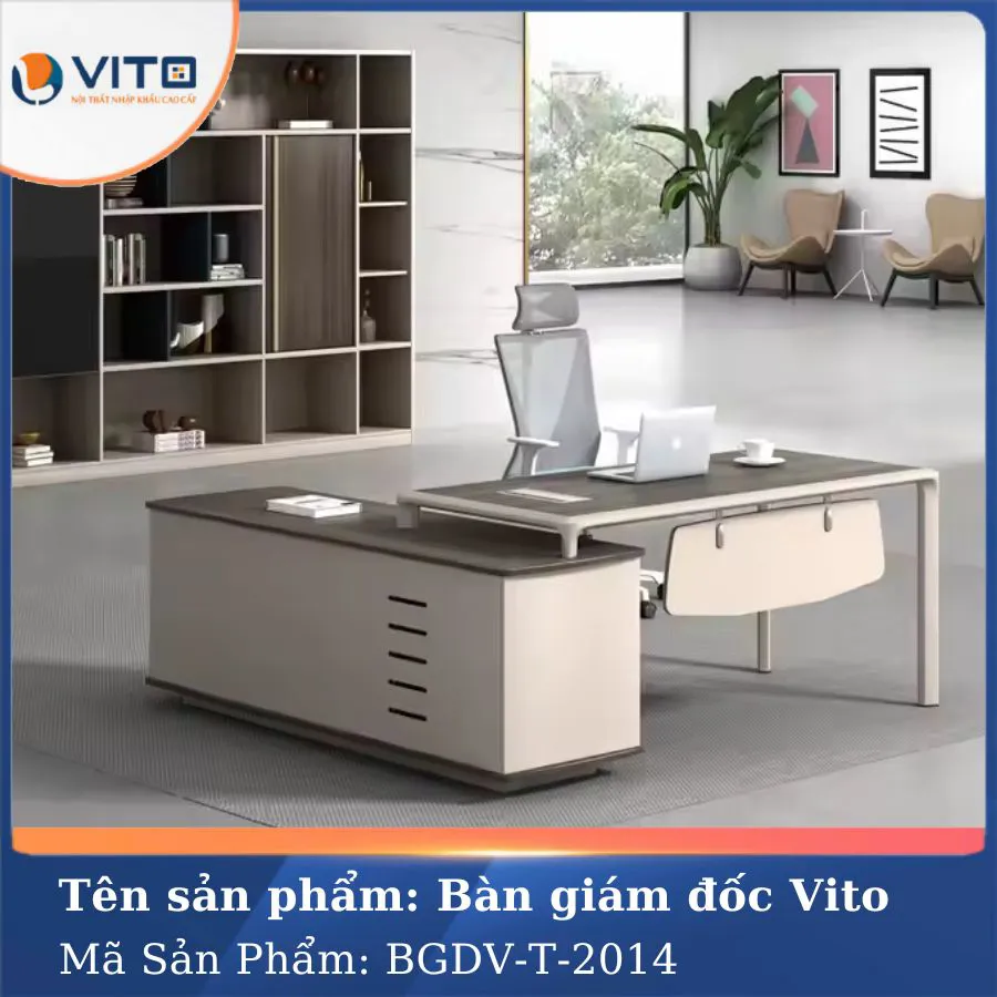 Bàn giám đốc Vito BGDV-T-2014 được thiết kế theo xu hướng tối giản nhưng không kém phần tinh tế. Tổng thể bàn có kiểu dáng vuông vức, kết hợp giữa hai gam màu chủ đạo là xám và trắng kem, tạo nên vẻ đẹp trang nhã, dễ dàng phối hợp với nhiều phong cách nội thất văn phòng khác nhau. Mặt bàn có kích thước rộng rãi, giúp giám đốc có thể thoải mái bố trí các vật dụng cần thiết như laptop, điện thoại, tài liệu, sổ sách mà vẫn giữ được sự gọn gàng.