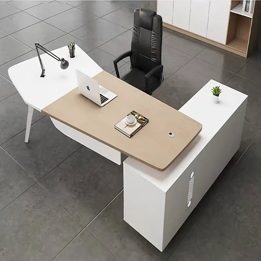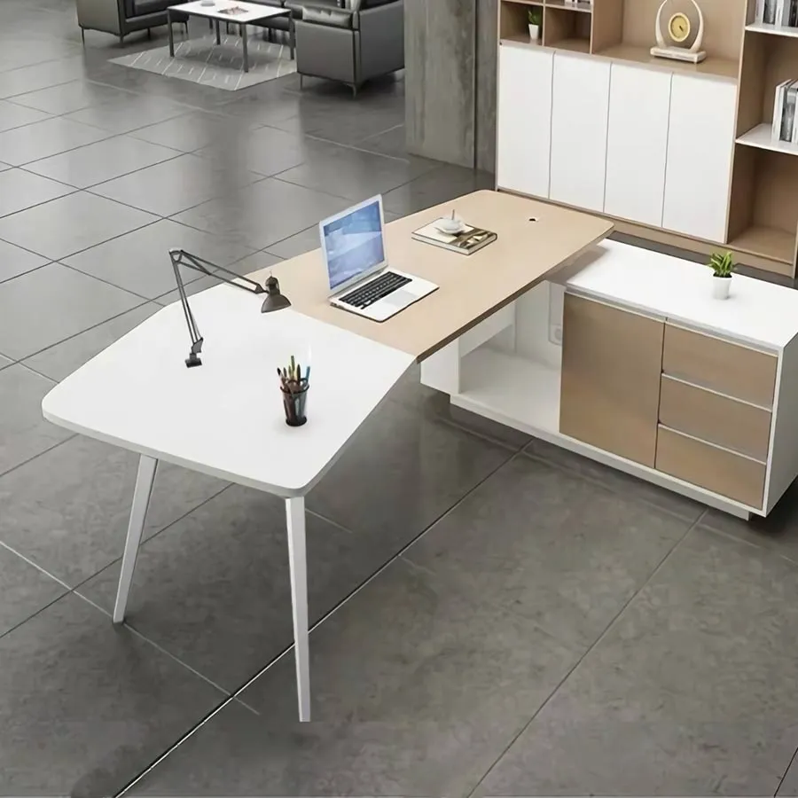 Điểm đặc biệt của mẫu bàn này là hệ thống tủ phụ đi kèm, được thiết kế sát bên bàn giúp tăng diện tích lưu trữ, đồng thời giữ cho không gian làm việc luôn ngăn nắp. Bàn còn được tích hợp hệ thống lỗ đi dây tiện lợi, giúp việc sắp xếp dây nguồn của máy tính, điện thoại hay các thiết bị điện tử trở nên gọn gàng hơn.