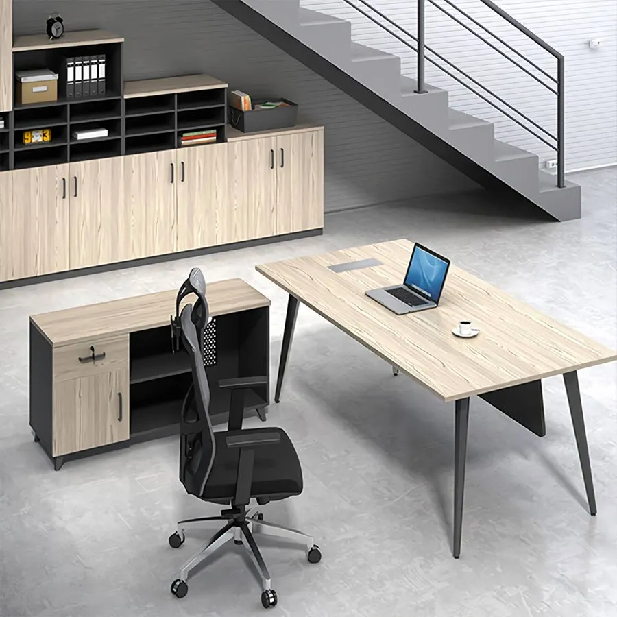 Điểm đặc biệt của mẫu bàn này là hệ thống tủ phụ đi kèm, được thiết kế sát bên bàn giúp tăng diện tích lưu trữ, đồng thời giữ cho không gian làm việc luôn ngăn nắp. Bàn còn được tích hợp hệ thống lỗ đi dây tiện lợi, giúp việc sắp xếp dây nguồn của máy tính, điện thoại hay các thiết bị điện tử trở nên gọn gàng hơn.