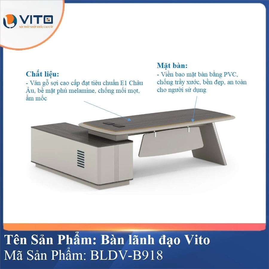 Sở hữu bàn lãnh đạo Vito B918, bạn không chỉ có một sản phẩm nội thất cao cấp mà còn thể hiện được vị thế và phong cách chuyên nghiệp trong công việc. Để sở hữu sản phẩm chất lượng này, quý khách hãy liên hệ ngay đến Vito để nhận được tư vấn chi tiết và những ưu đãi hấp dẫn nhất.
