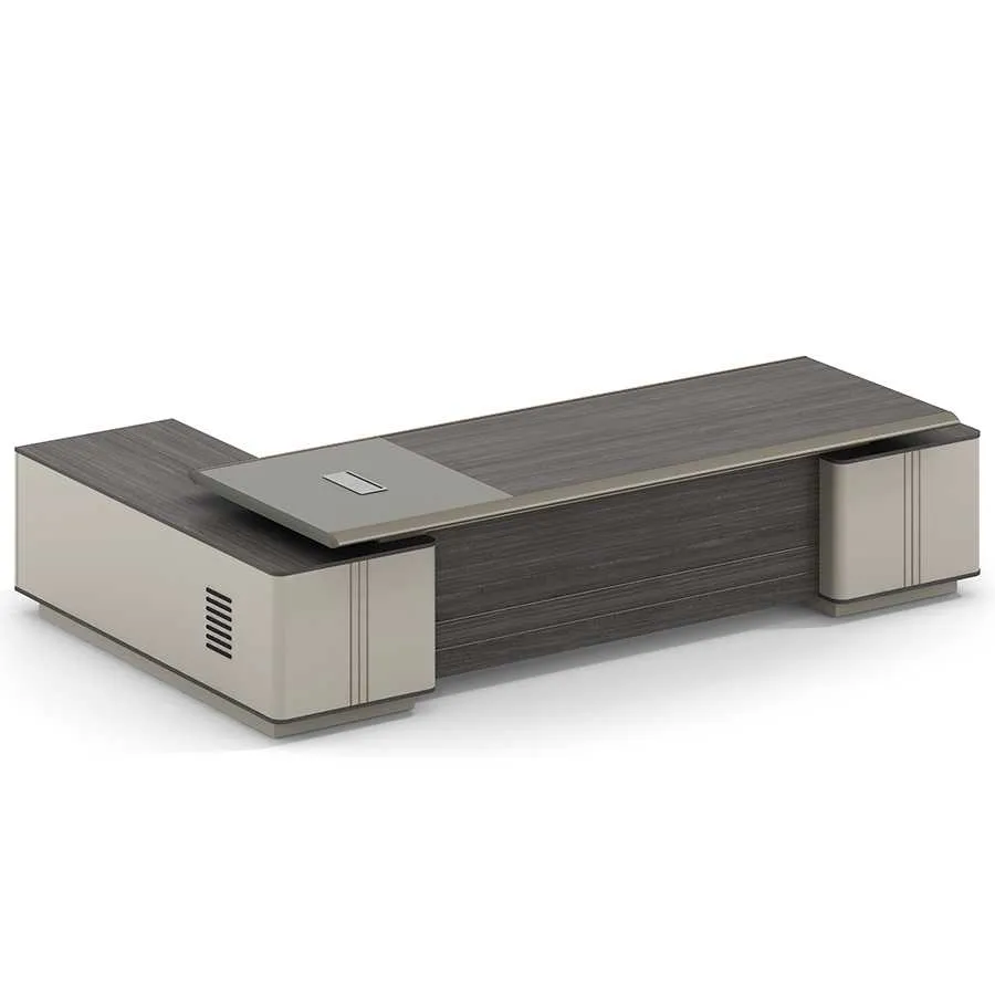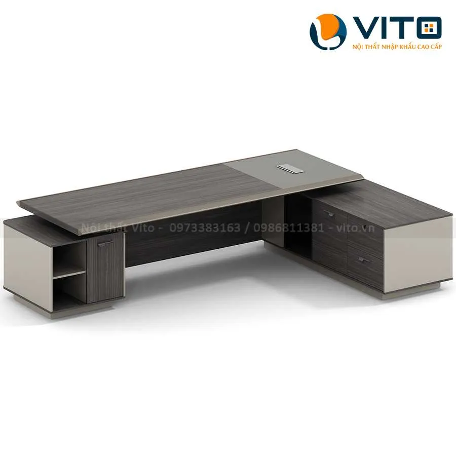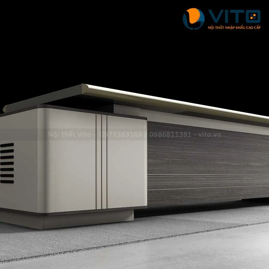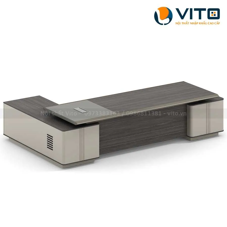 Bàn lãnh đạo Vito BLDV-B910-2 tự hào là mẫu bàn chiếm ưu thế nhất trong số các bàn giám đốc hiện có của Vito. Mặt bàn vân gỗ óc chó với thiết kế nổi, xung quanh có ốp nhôm bo viền mang tính thẩm mỹ cao. Nắp nhôm đi dây điện được thiết kế trên mặt tủ phụ, ẩn dưới mặt bàn bố trí hệ thống dây điện gọn gàng, khoa học.