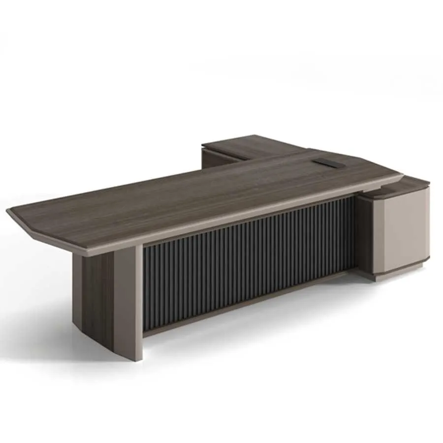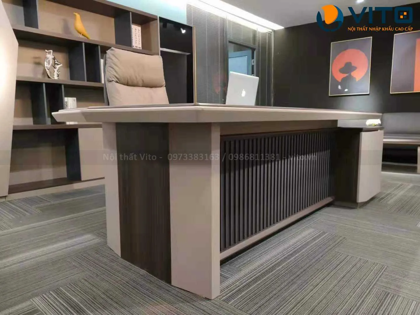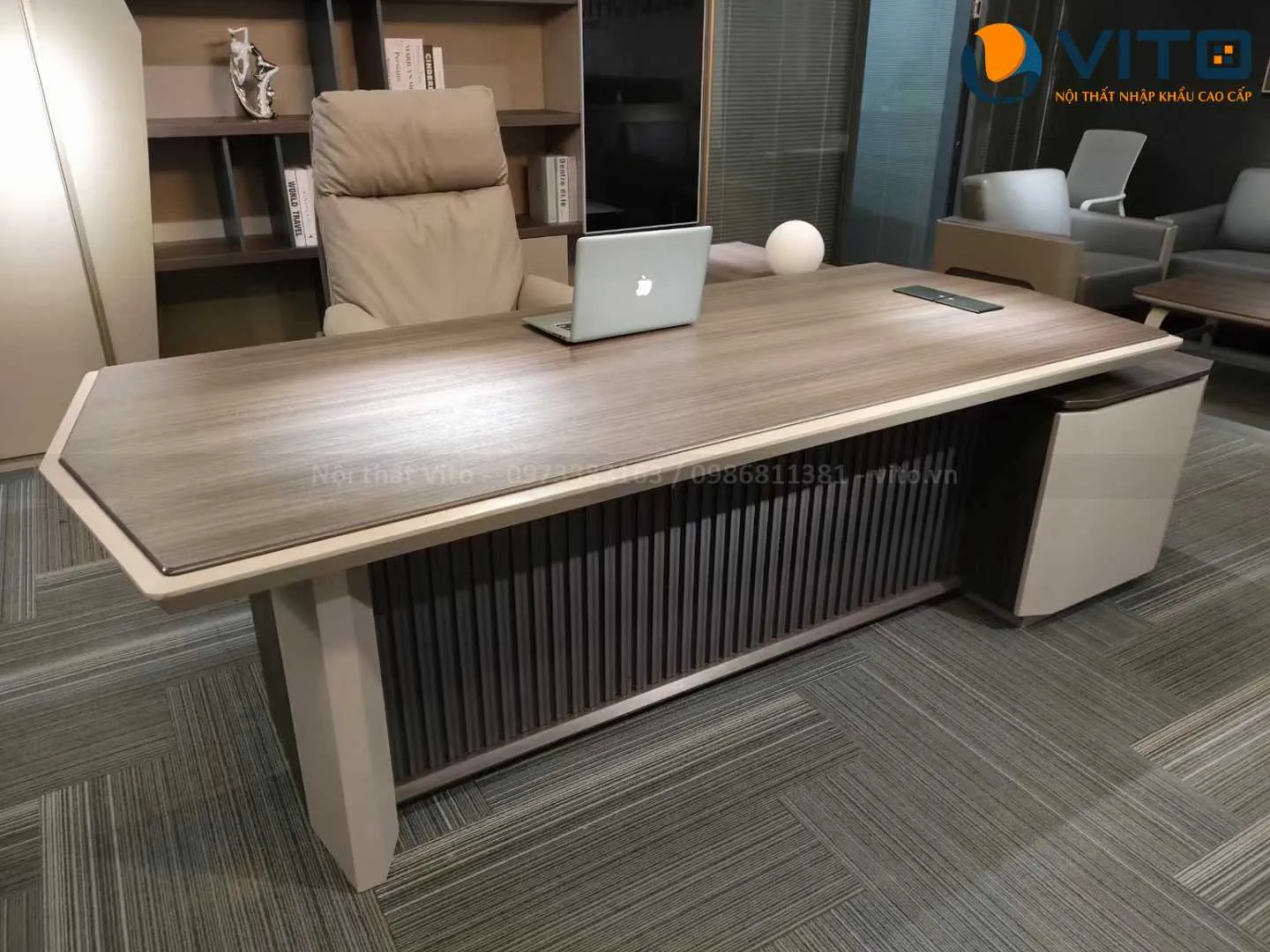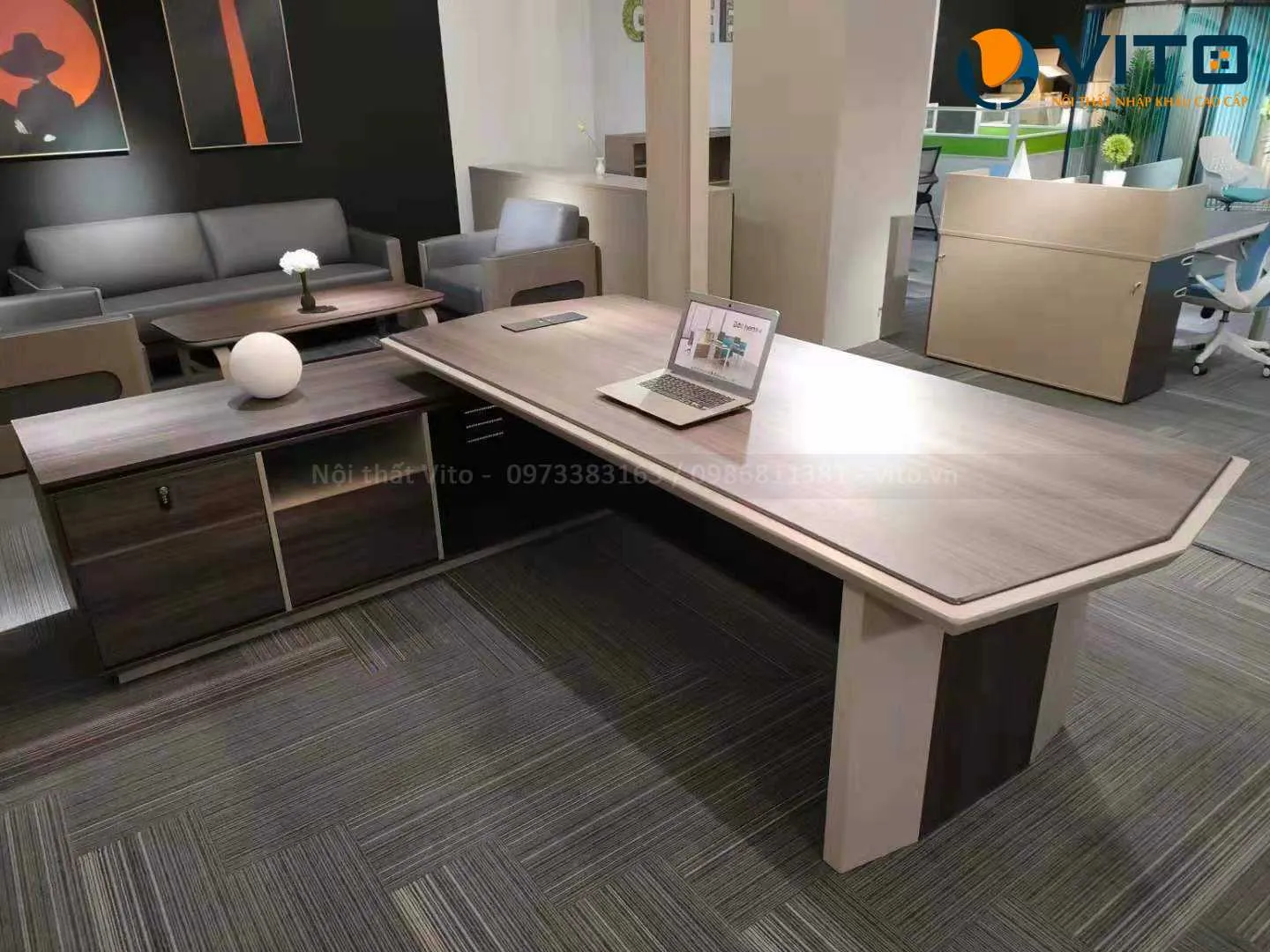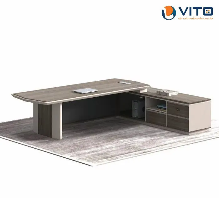 Các mẫu bàn được thiết kế theo phong cách hiện đại, kết hợp hài hòa giữa sự mạnh mẽ và tinh tế, phù hợp với nhiều không gian văn phòng khác nhau. Ngoài ra, Vito còn cung cấp nhiều kiểu dáng bàn đa dạng, từ bàn chữ nhật truyền thống đến bàn góc L tiện lợi, giúp tối ưu không gian làm việc. Các chi tiết trang trí tinh xảo, kết hợp giữa gỗ và kim loại, mang đến sự sang trọng và đẳng cấp cho phòng làm việc của các lãnh đạo.