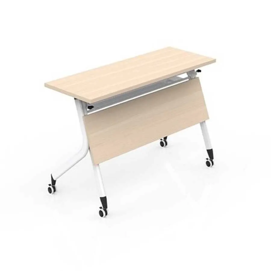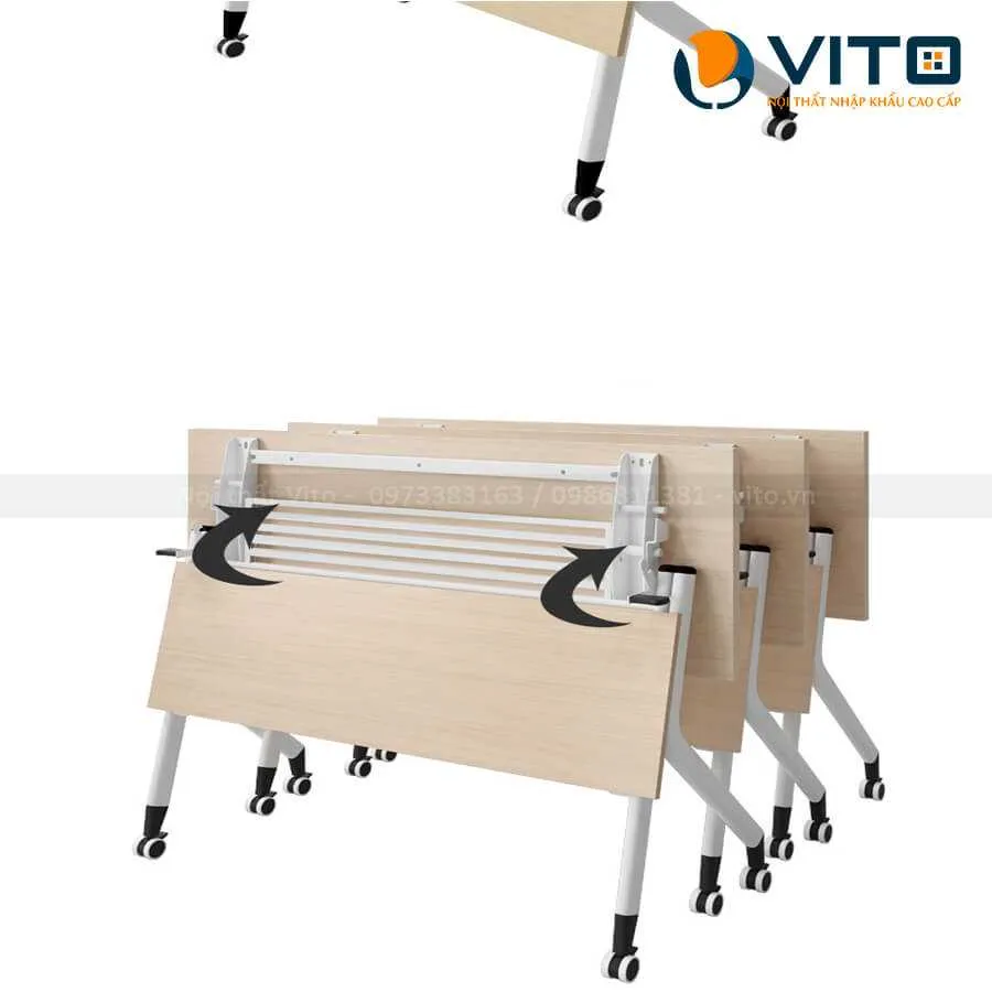 Một điểm đặc biệt của mẫu bàn này là khả năng gấp gọn mặt bàn thông qua cơ chế lật tiện lợi. Khi không sử dụng, bạn có thể gấp gọn và xếp chồng bàn một cách dễ dàng, giúp tối ưu không gian lưu trữ. Thiết kế bàn dạng gấp, công tác gấp được thực hiện bằng tay, giúp tối ưu hóa diện tích không gian văn phòng khi không sử dụng.