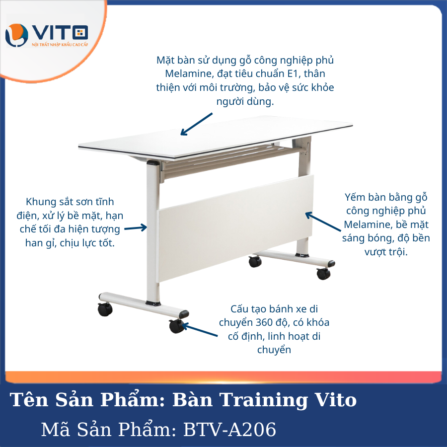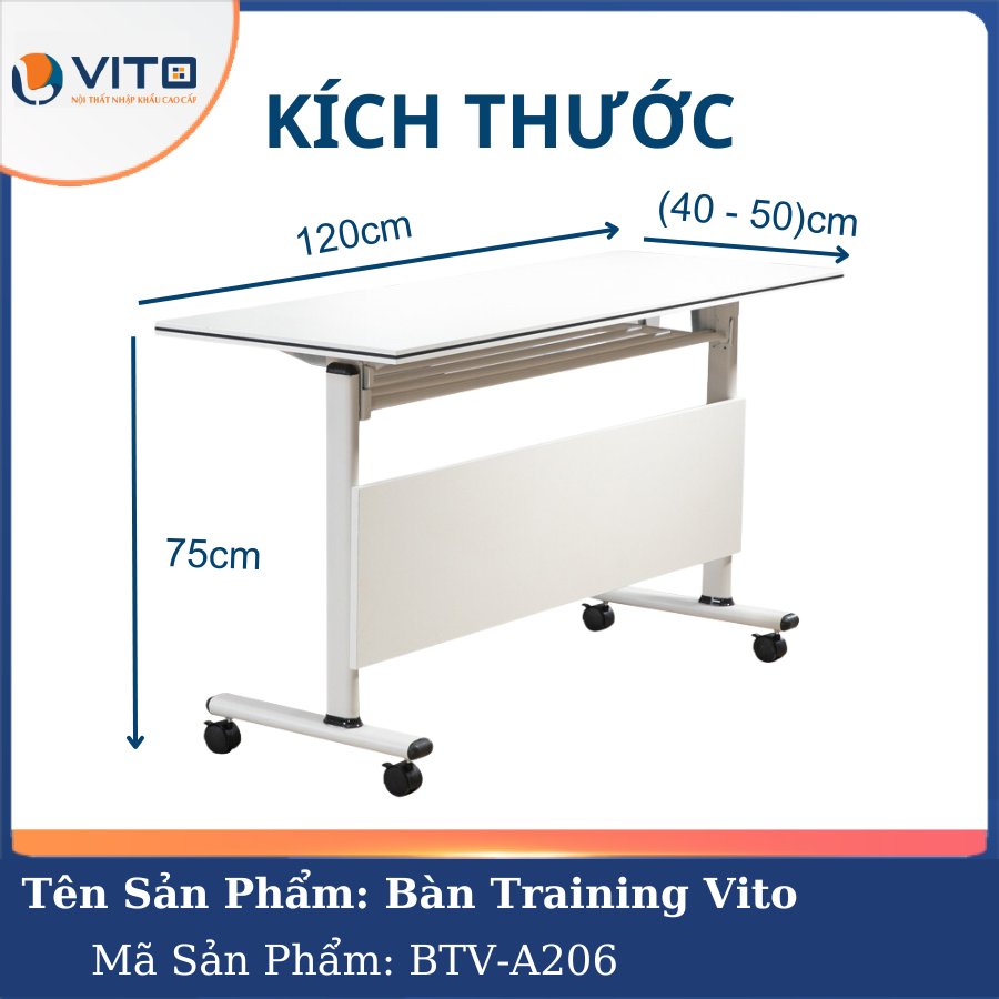 Bàn training Vito BTV-A206 là một sự lựa chọn hoàn hảo dành cho những ai đang tìm kiếm một mẫu bàn linh hoạt, hiện đại và tiện dụng. Sản phẩm không chỉ có thiết kế đẹp mắt, chất liệu bền bỉ mà còn đáp ứng tối đa nhu cầu sử dụng trong nhiều không gian khác nhau. Để sở hữu mẫu bàn training chất lượng này, quý khách hãy liên hệ ngay đến Vito để nhận được tư vấn chi tiết nhất.