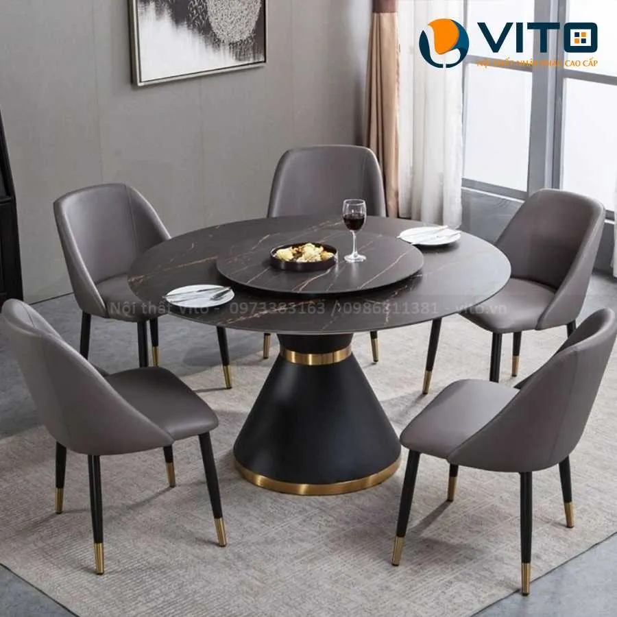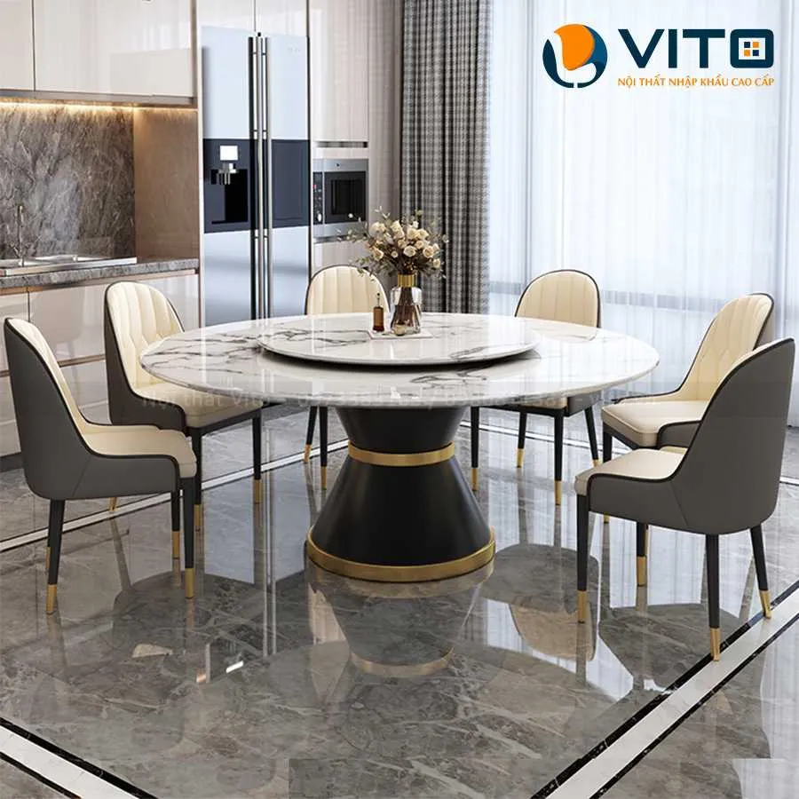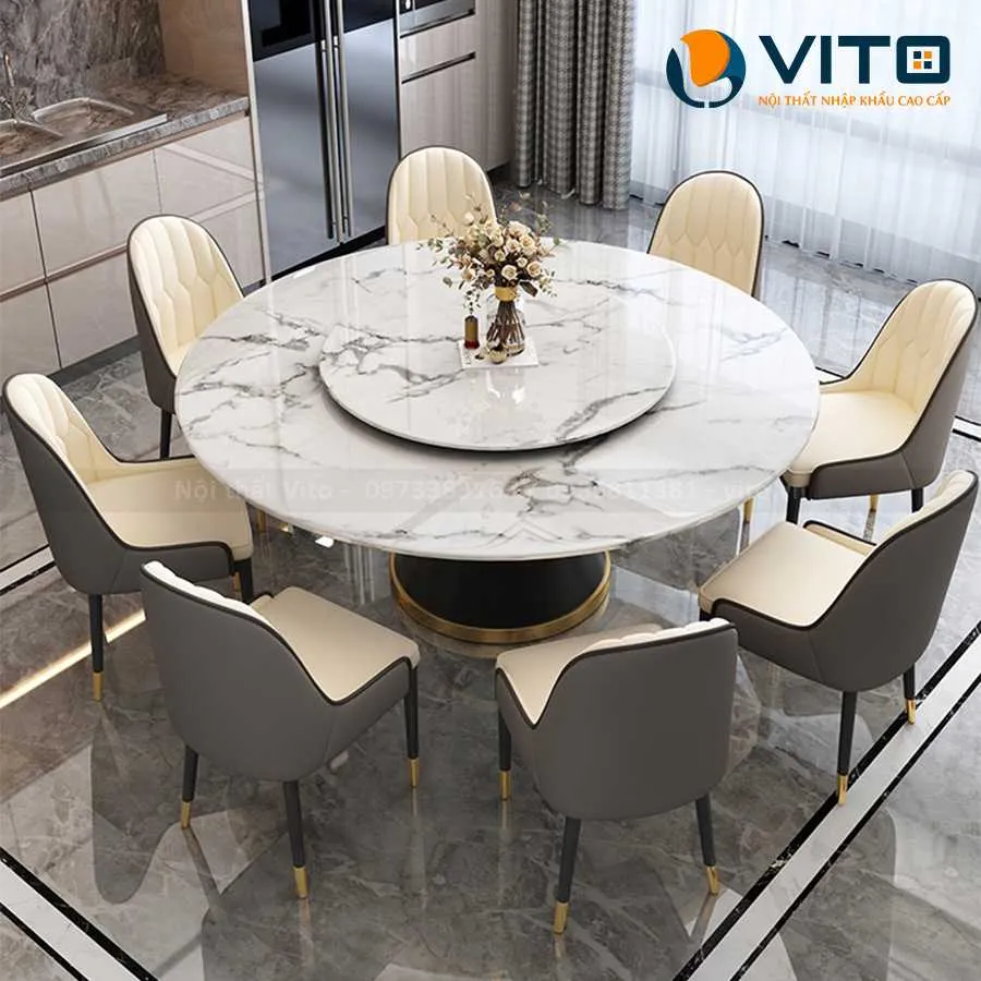 Bộ bàn ghế ăn nhập khẩu Vito BGAV-BGD06 mang lại trải nghiệm giống như đi ăn tại một nhà hàng 5 sao. Bộ ghế được bọc da nhân tạo bền đẹp, dễ dàng vệ sinh. Hệ bàn tròn xoay tiện lợi cho mọi người trong quá trình thưởng thức các món ngon gia đình.