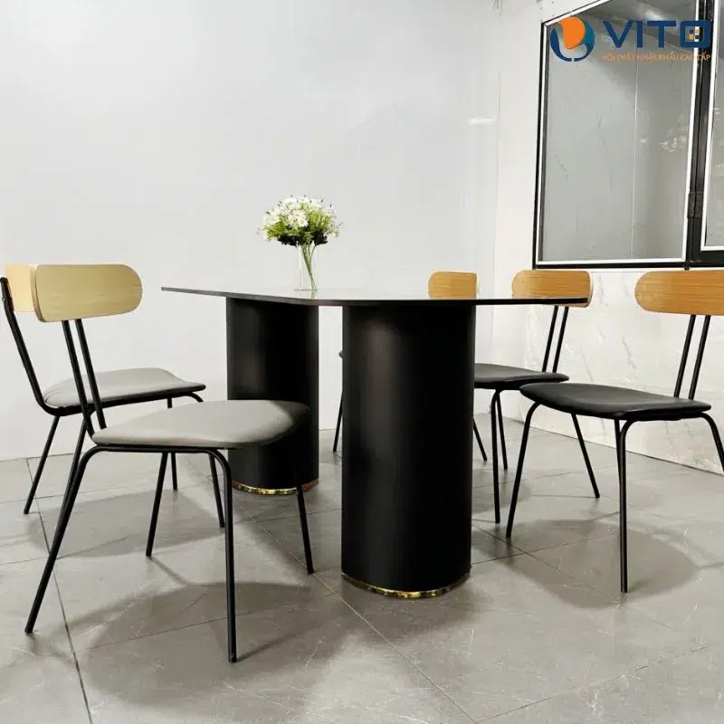 Đệm ngồi của ghế được bọc da hoặc vải êm ái, chất liệu mút mật độ cao giữ được form dáng sau thời gian dài sử dụng. Bên cạnh đó, phần chân ghế thon gọn, được sơn tĩnh điện màu đen nhám, không chỉ tăng tính thẩm mỹ mà còn giúp sản phẩm trở nên cứng cáp, bền bỉ, và dễ dàng phối hợp với nhiều kiểu không gian nội thất khác nhau như hiện đại, tối giản.