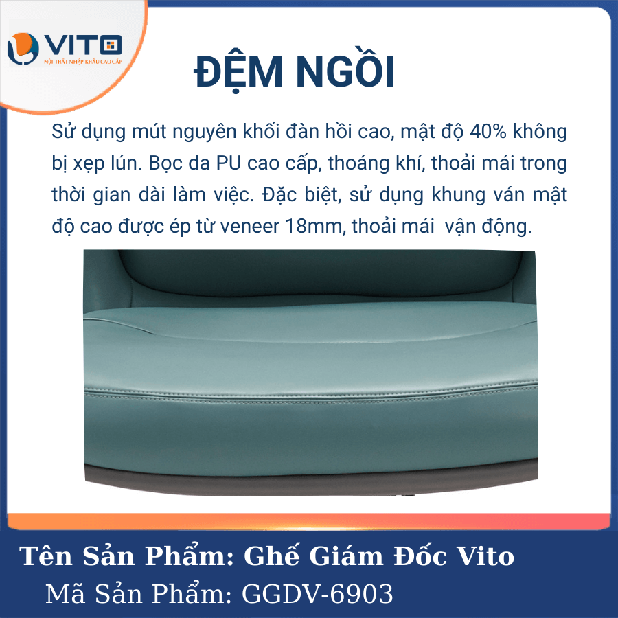 Khung ghế được làm từ chất liệu cao cấp, đảm bảo khả năng chịu lực tốt và chống ăn mòn hiệu quả. Sử dụng đệm lót và da mềm mại không chỉ mang lại cảm giác thoải mái mà còn rất dễ vệ sinh và bảo quản. Đặc biệt ghế giám đốc Vito GGDV-A6903 được thiết kế và sản xuất theo các tiêu chuẩn nghiêm ngặt, đảm bảo an toàn tuyệt đối cho người sử dụng. Các bộ phận chính như cơ chế xoay, điều chỉnh độ cao và nghiêng lưng đều được kiểm tra kỹ lưỡng, đáp ứng các yêu cầu về độ bền và độ ổn định.