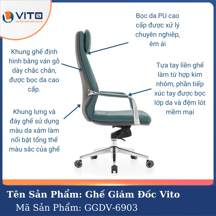 Ghế giám đốc Vito GGDV-A6903 sở hữu một thiết kế tinh tế và sang trọng, đáp ứng các tiêu chuẩn cao về thẩm mỹ và chất lượng. Khung ghế làm bằng ván ép mật độ cao được ép từ veneer 18mm, khung chân sử dụng hợp kim nhôm không han gỉ, bền bỉ và chịu lực tốt, trong khi phần lưng và ngồi được bọc da cao cấp, mang đến cảm giác thoải mái và êm ái khi sử dụng.