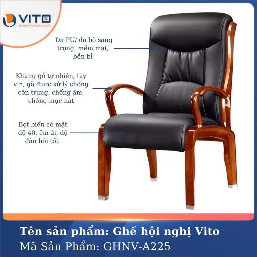 Ghế hội nghị Vito GHNV-A225 có thiết kế tinh tế với phần lưng tựa cao, uốn cong nhẹ giúp nâng đỡ toàn bộ vùng lưng và cổ, tạo sự thoải mái khi ngồi lâu. Kiểu dáng thanh lịch, kết hợp giữa chất liệu da PU hoặc da bò cao cấp cùng khung gỗ tự nhiên, giúp sản phẩm mang vẻ đẹp sang trọng, phù hợp với nhiều không gian khác nhau như phòng họp doanh nghiệp, phòng tiếp khách hay văn phòng giám đốc.
