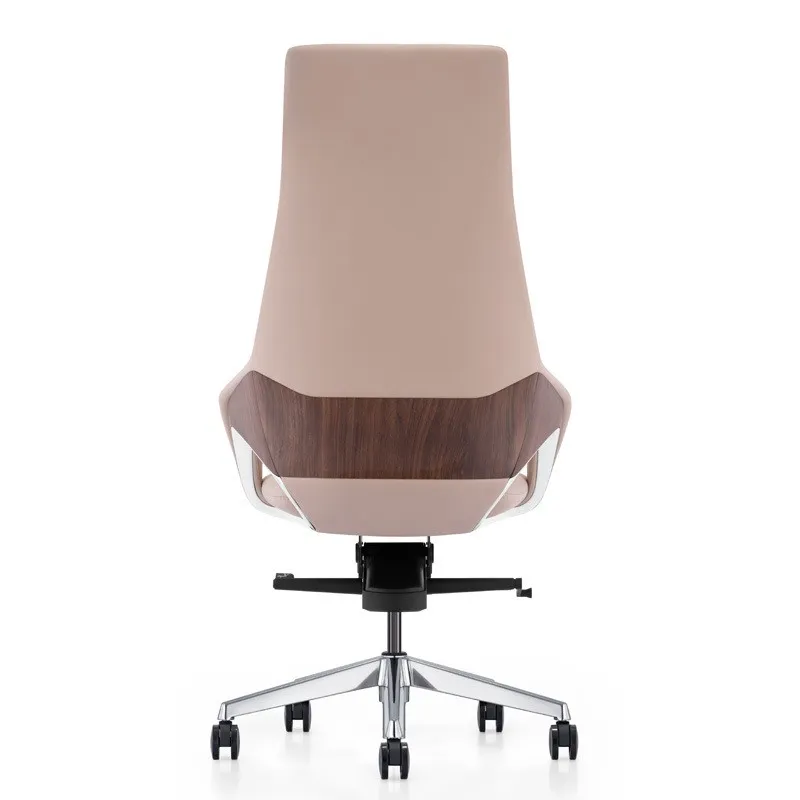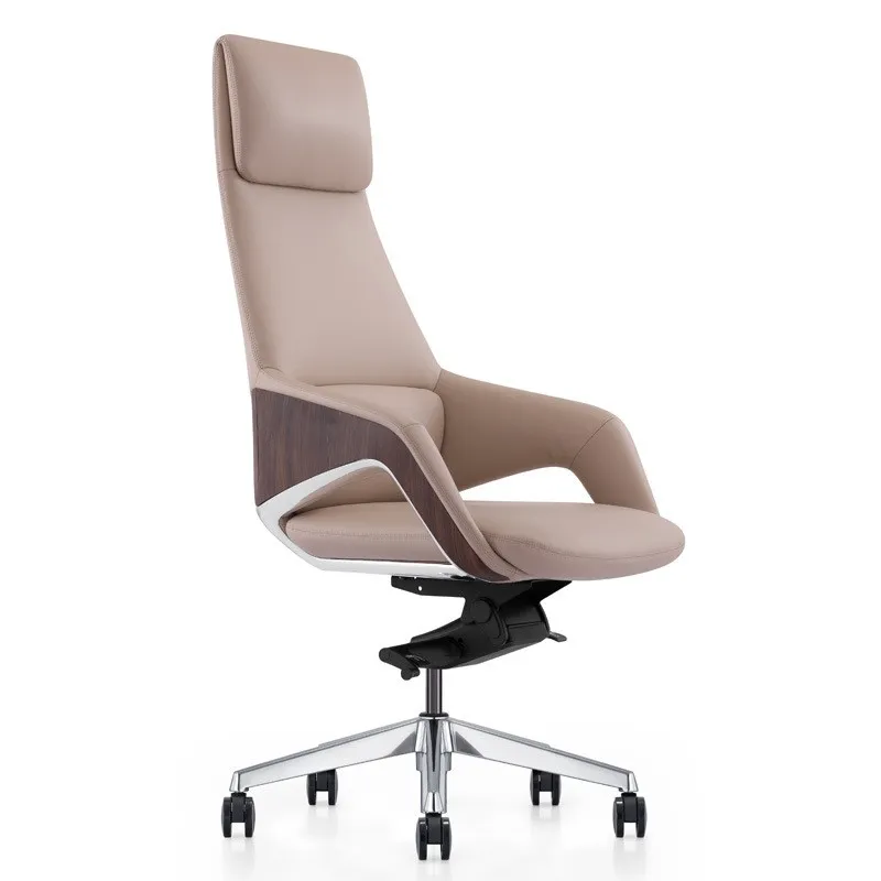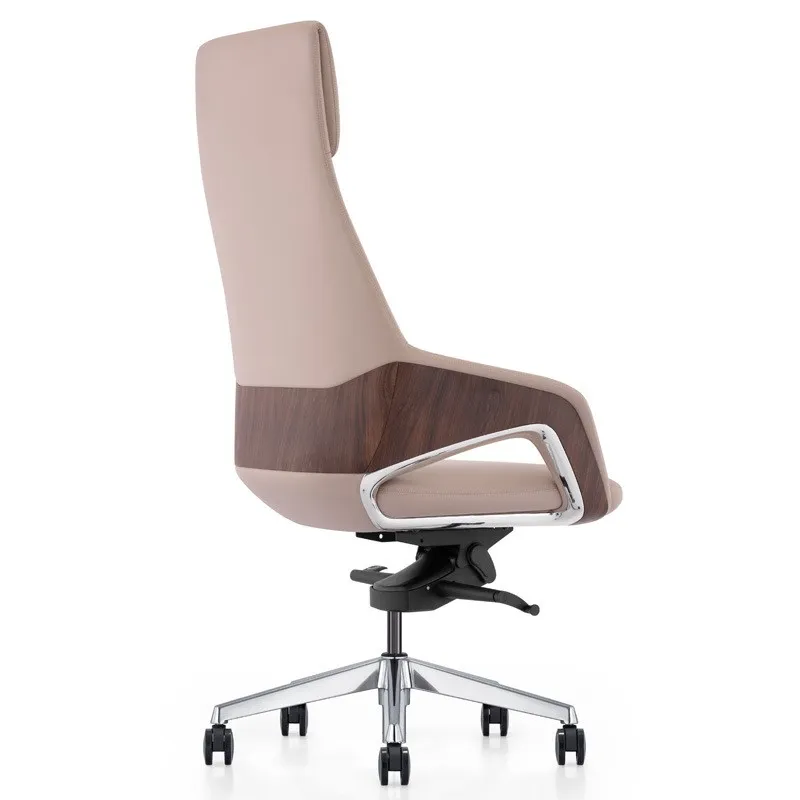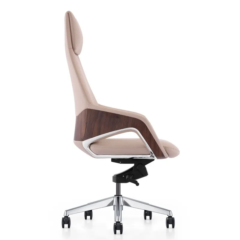 Cấu tạo ở phần tựa đầu hơi nhô ra trước, uốn cong nhẹ ở phần lưng ôm trọn vào phần cổ và phần cột sống, mang đến cảm giác thư giãn tuyệt đối. Điểm nhấn đặc biệt của sản phẩm này chính là phần khung ghế chắc chắn, được làm từ chất liệu kim loại cao cấp, kết hợp với lớp gỗ ốp sang trọng ở hai bên tay vịn. Sự kết hợp giữa kim loại và gỗ mang đến vẻ đẹp hiện đại nhưng không kém phần tinh tế, giúp tôn lên đẳng cấp của không gian làm việc.