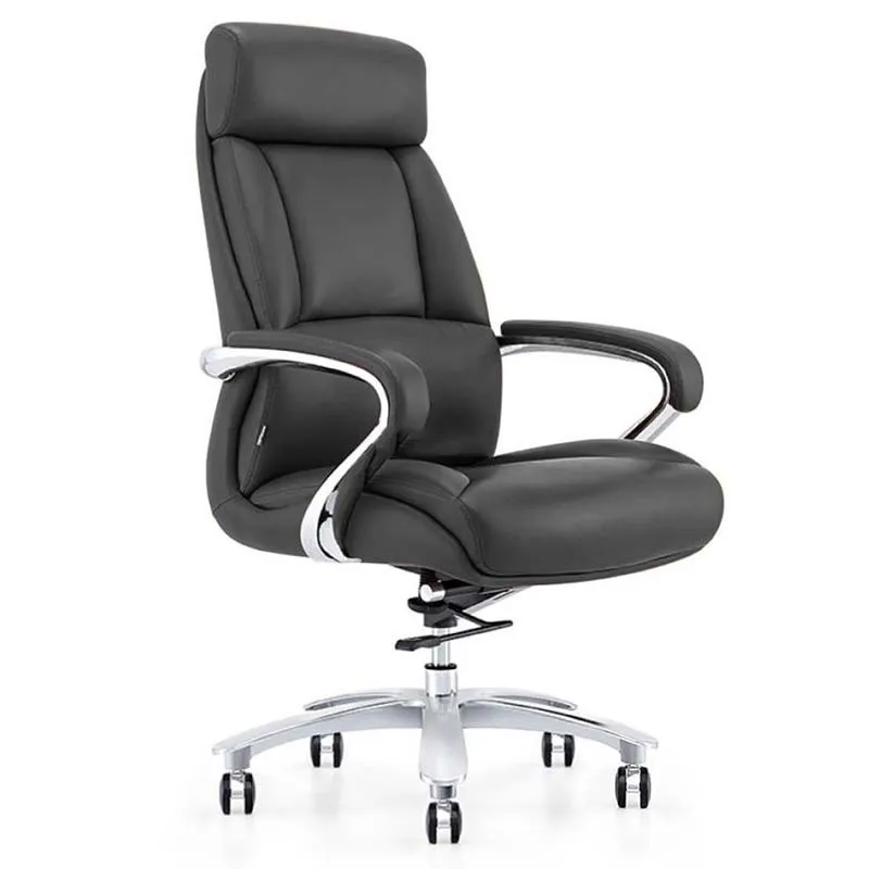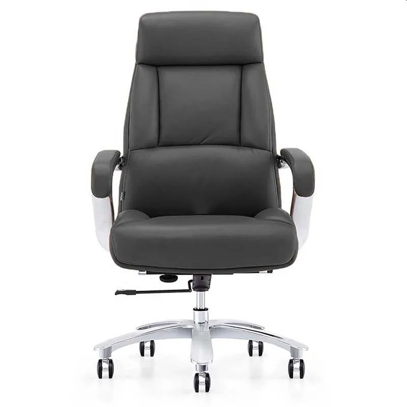 Khung tay hợp kim nhôm bọc da bò mềm mại, thiết kế phù hợp với chiều dài cánh tay người dùng giúp làm việc thoải mái. Phần đầu ghế được thiết kế cao, tạo sự nâng đỡ tuyệt vời cho cổ và vai gáy, giúp người dùng có thể ngả lưng thư giãn ngay tại văn phòng sau những giờ làm việc căng thẳng. Thiết kế này không chỉ mang lại sự tiện nghi mà còn thể hiện phong thái sang trọng, quyền uy của người lãnh đạo.