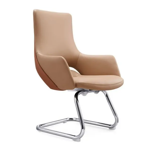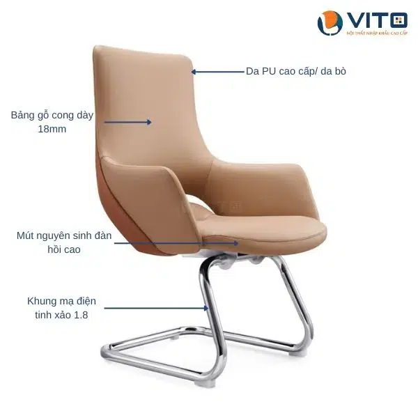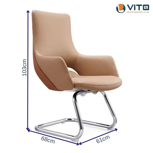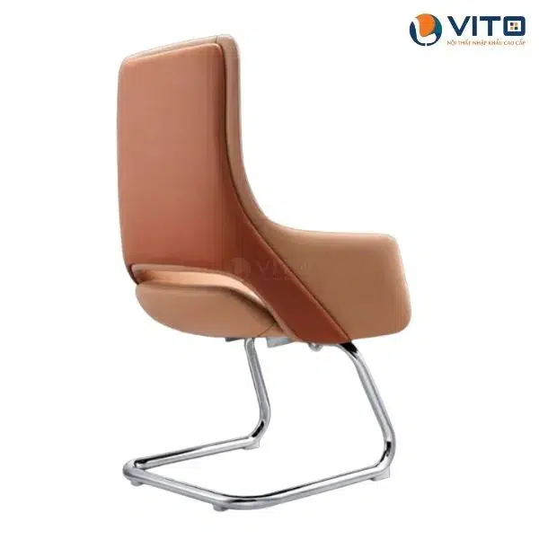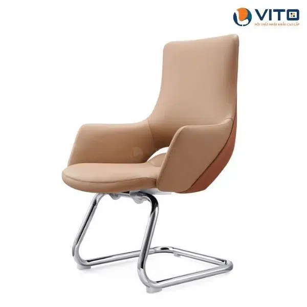 Phần tay vịn được thiết kế cân đối, bọc da êm ái, mang đến cảm giác thoải mái khi sử dụng. Khung ghế dạng quỳ uốn cong mạnh mẽ, chắc chắn nhưng vẫn giữ được sự thanh thoát trong tổng thể. Với kiểu dáng lịch lãm và sang trọng, ghế dễ dàng kết hợp trong nhiều không gian khác nhau như phòng họp, phòng lãnh đạo, khu vực tiếp khách hoặc văn phòng cá nhân.