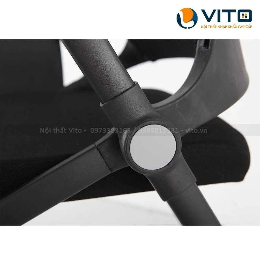 | Chất liệu | Khung thép sơn tĩnh điện màu đen, chân ghế ống dẹt 18×32, độ dày thành chân 1.5mm; Tựa lưng khung bằng nhựa, lưng bọc vải lưới, đệm nhồi mút bọc vải, có tay vịn; khớp nối bằng hợp kim. |