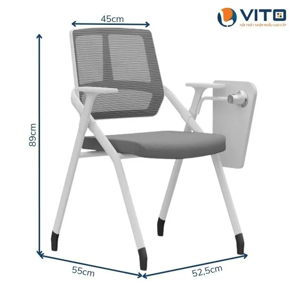 Đặc biệt, ghế được tích hợp bàn viết tiện dụng, làm từ nhựa ABS cao cấp, loại vật liệu nổi tiếng với độ bền, khả năng chịu lực cao và chống trầy xước tốt. Bàn viết có thể gập gọn khi không dùng, giúp tiết kiệm không gian và tạo sự linh hoạt trong bố trí chỗ ngồi. Đây là chi tiết vô cùng quan trọng trong những lớp học, hội thảo hoặc phòng họp cần ghi chép thường xuyên.