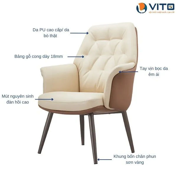 Ghế văn phòng Vito GVPV-6836D-1 được chế tác từ những chất liệu chọn lọc, đảm bảo cả độ bền lẫn tính thẩm mỹ. Bề mặt ghế sử dụng da PU cao cấp dày 1.5mm, có khả năng chống bong tróc, dễ lau chùi, đồng thời giữ được độ mềm mại, sáng bóng theo thời gian. Đối với khách hàng yêu cầu cao hơn, có thể lựa chọn phiên bản da bò nhập khẩu lớp đầu tiên, mang lại sự sang trọng và độ bền vượt trội.