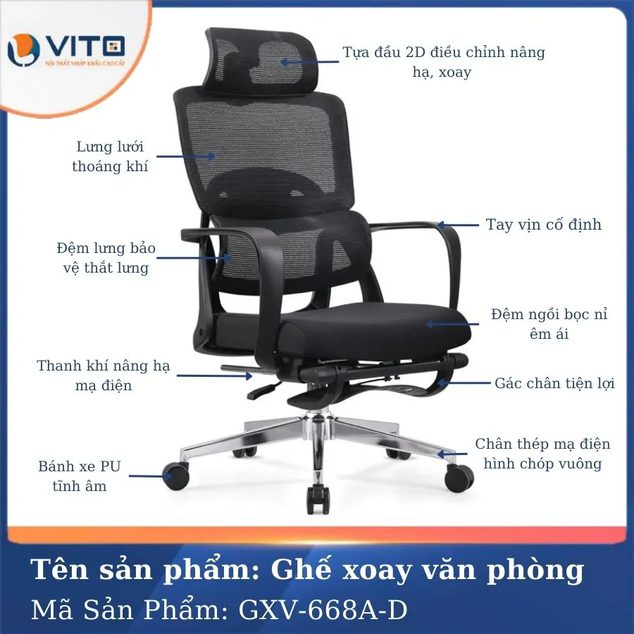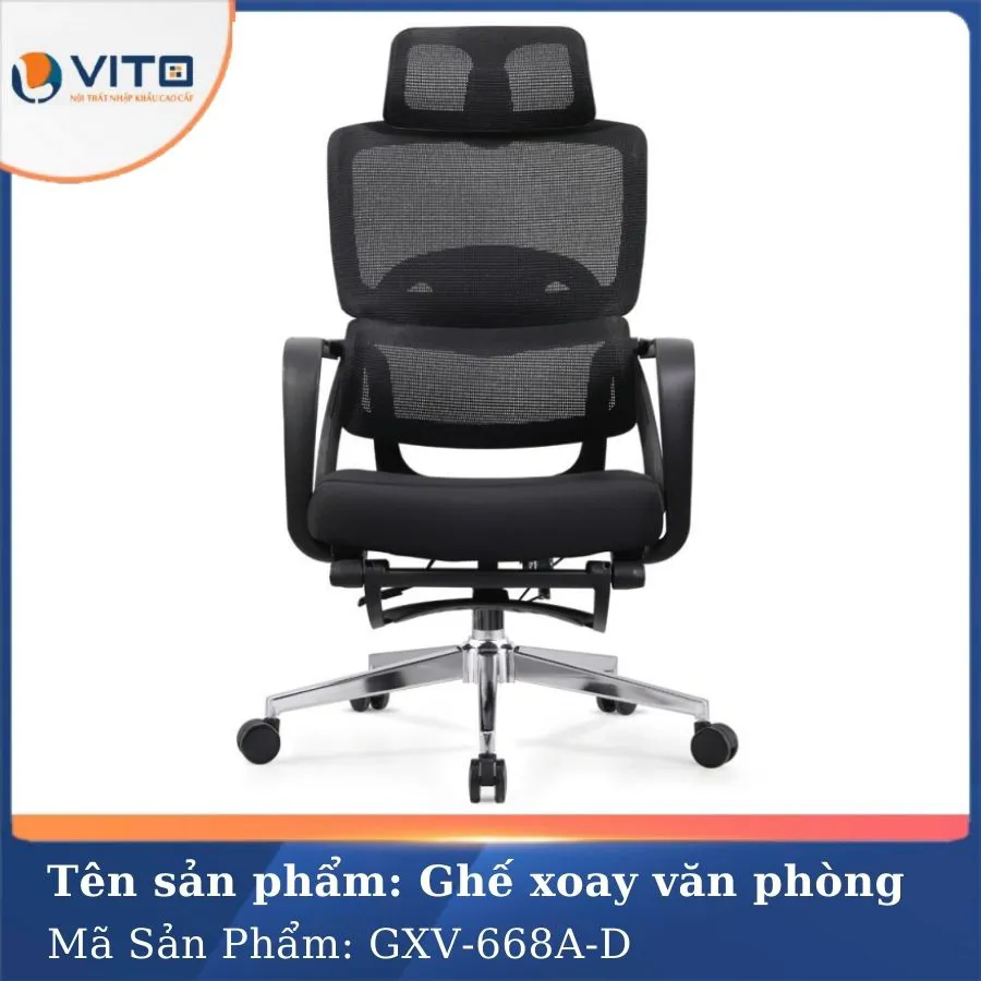 Lựa chọn Ghế xoay văn phòng GXV-668A-D không chỉ là đầu tư vào một chiếc ghế văn phòng, mà là đầu tư vào sức khỏe, hiệu quả làm việc và trải nghiệm ngồi lâu dài. Với thiết kế công thái học, tính năng thông minh và chất lượng bền bỉ, ghế xoay GXV-668A-D mang lại cảm giác ngồi êm ái, nâng đỡ toàn bộ cơ thể và giảm thiểu các vấn đề về cột sống thường gặp khi ngồi lâu. Đây là sản phẩm đáng cân nhắc cho bất kỳ ai đang tìm kiếm một chiếc ghế hội tụ đủ các yếu tố: thẩm mỹ – tiện nghi – và bảo vệ sức khỏe. Để sở hữu mẫu ghế ngồi văn phòng chất lượng này, quý khách hãy liên hệ ngay đến Vito để nhận được tư vấn chi tiết và những ưu đãi hấp dẫn nhất.