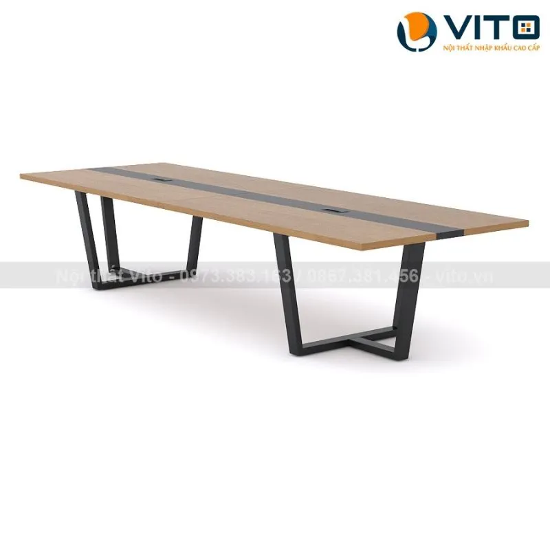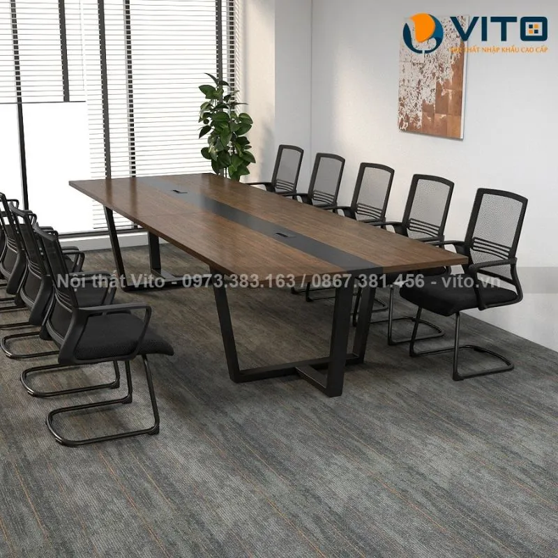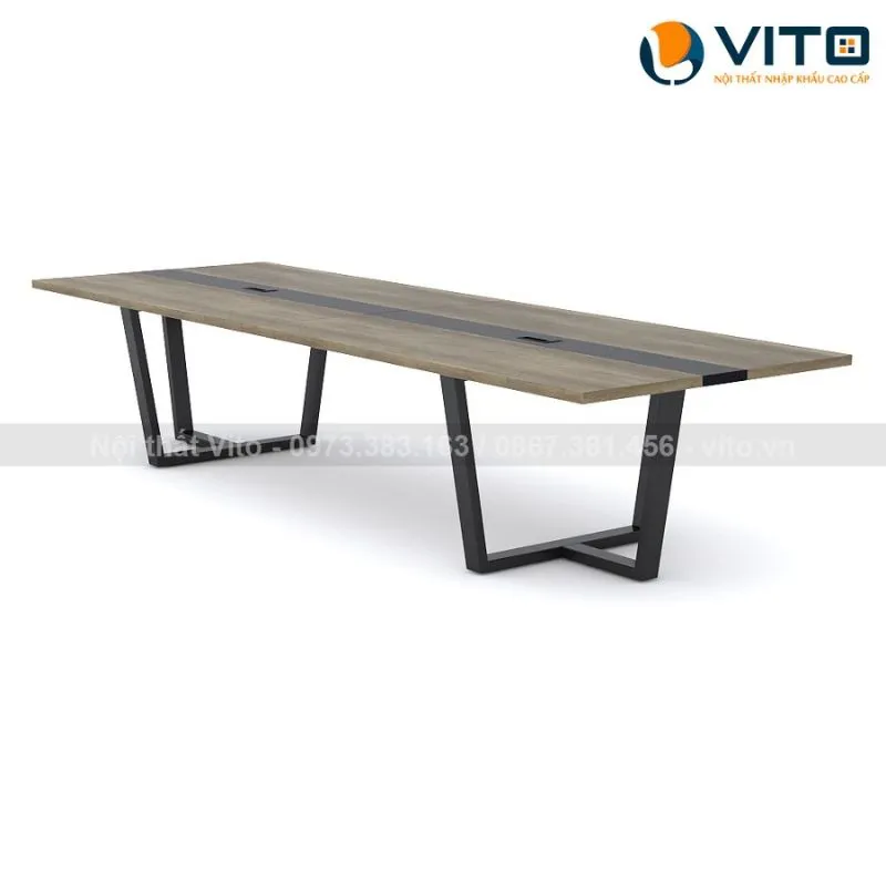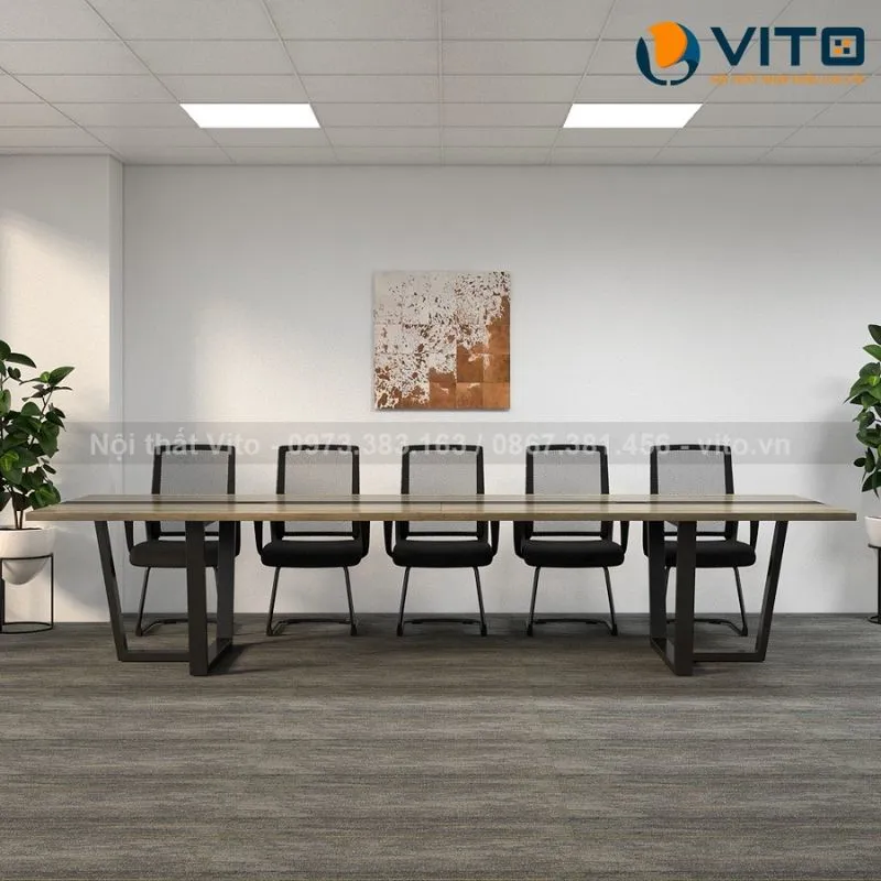 Một trong những điểm nổi bật đầu tiên của mẫu bàn chân sắt MDV-T8D-3 chính là thiết kế theo phong cách tối giản nhưng vô cùng chắc chắn và hiện đại. Bàn được thiết kế theo dạng module chữ nhật dài, phù hợp cho 8 đến 10 người ngồi, tùy theo nhu cầu bố trí. Phần mặt bàn liền mạch, không chia khối gây rối mắt, giúp tạo cảm giác rộng rãi, chuyên nghiệp và thống nhất. Cạnh bàn được bo vuông dứt khoát, kết hợp với bề mặt vân gỗ sáng tạo nên tổng thể hài hòa, thanh lịch nhưng vẫn mang lại cảm giác mạnh mẽ và vững chãi.