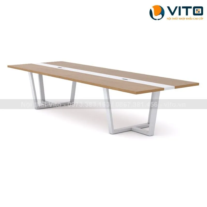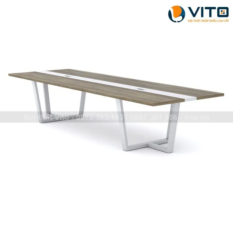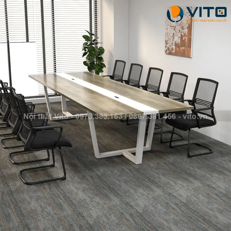 Một trong những điểm nổi bật đầu tiên của mẫu bàn chân sắt MDV-T8T-3 chính là thiết kế theo phong cách tối giản nhưng vô cùng chắc chắn và hiện đại. Bàn được thiết kế theo dạng module chữ nhật dài, phù hợp cho 8 đến 10 người ngồi, tùy theo nhu cầu bố trí. Phần mặt bàn liền mạch, không chia khối gây rối mắt, giúp tạo cảm giác rộng rãi, chuyên nghiệp và thống nhất. Cạnh bàn được bo vuông dứt khoát, kết hợp với bề mặt vân gỗ sáng tạo nên tổng thể hài hòa, thanh lịch nhưng vẫn mang lại cảm giác mạnh mẽ và vững chãi.