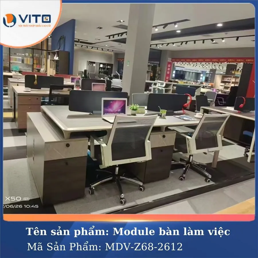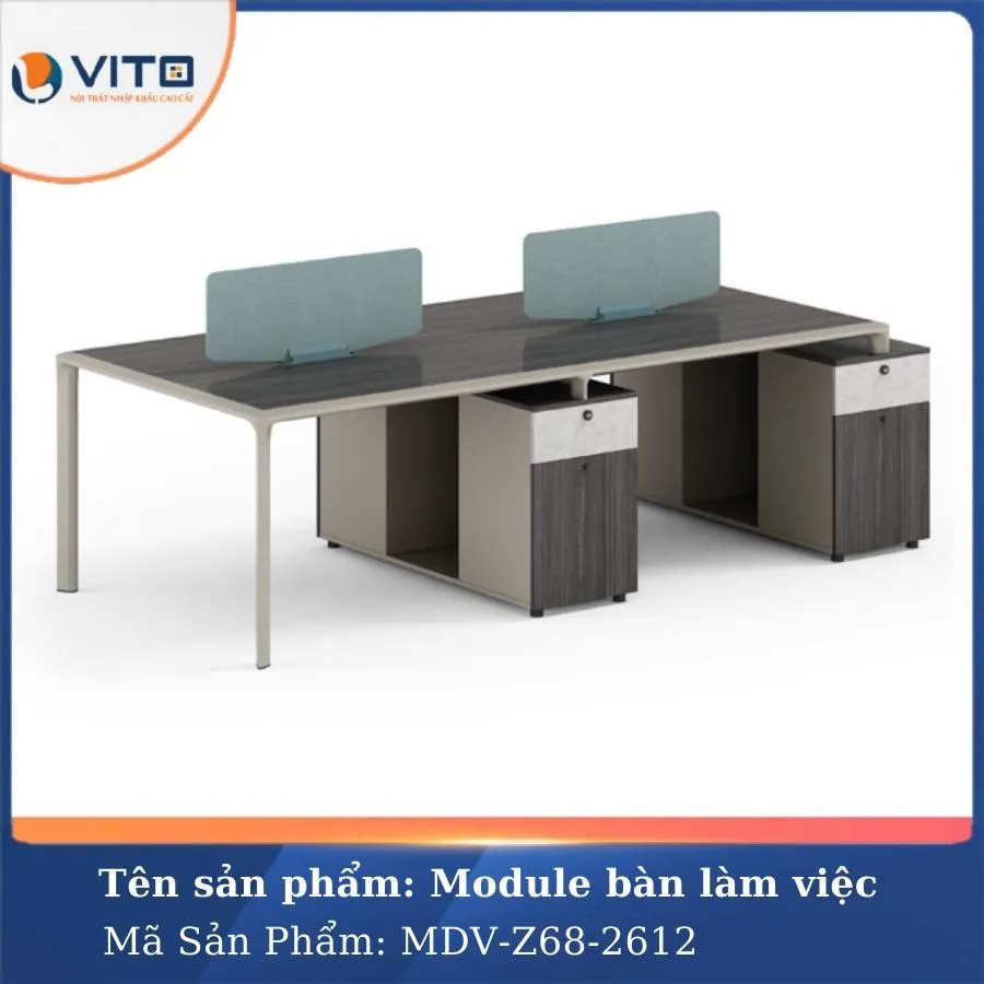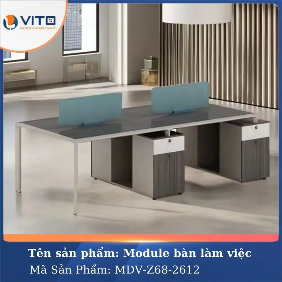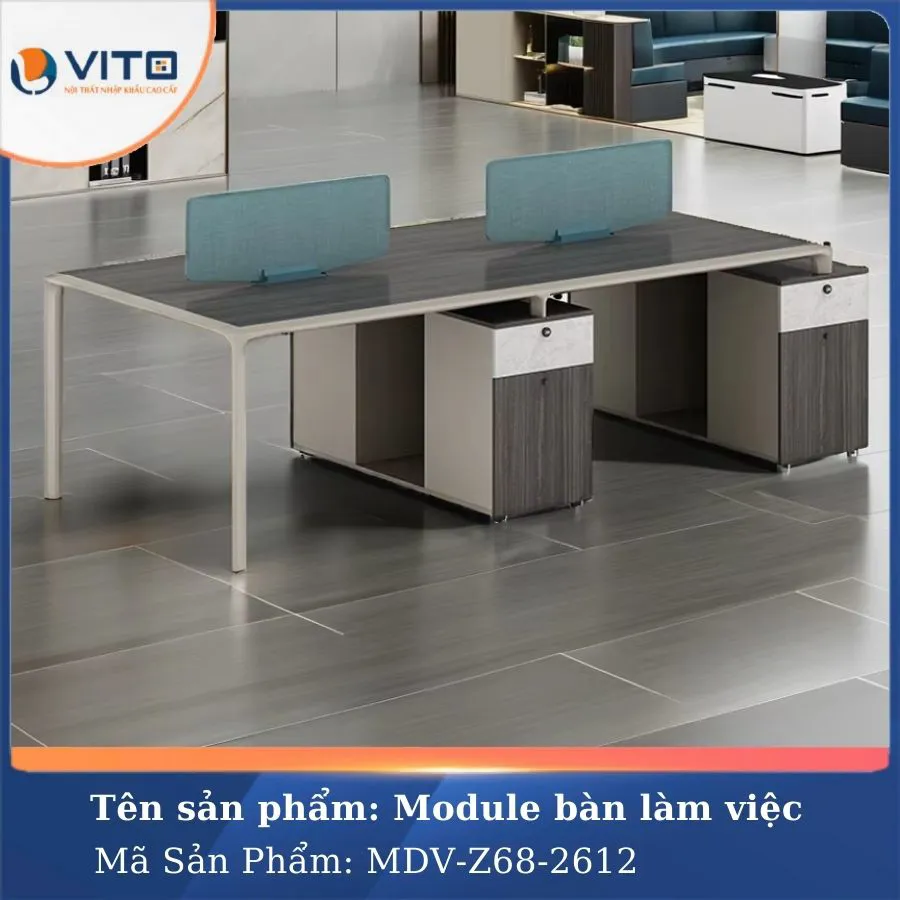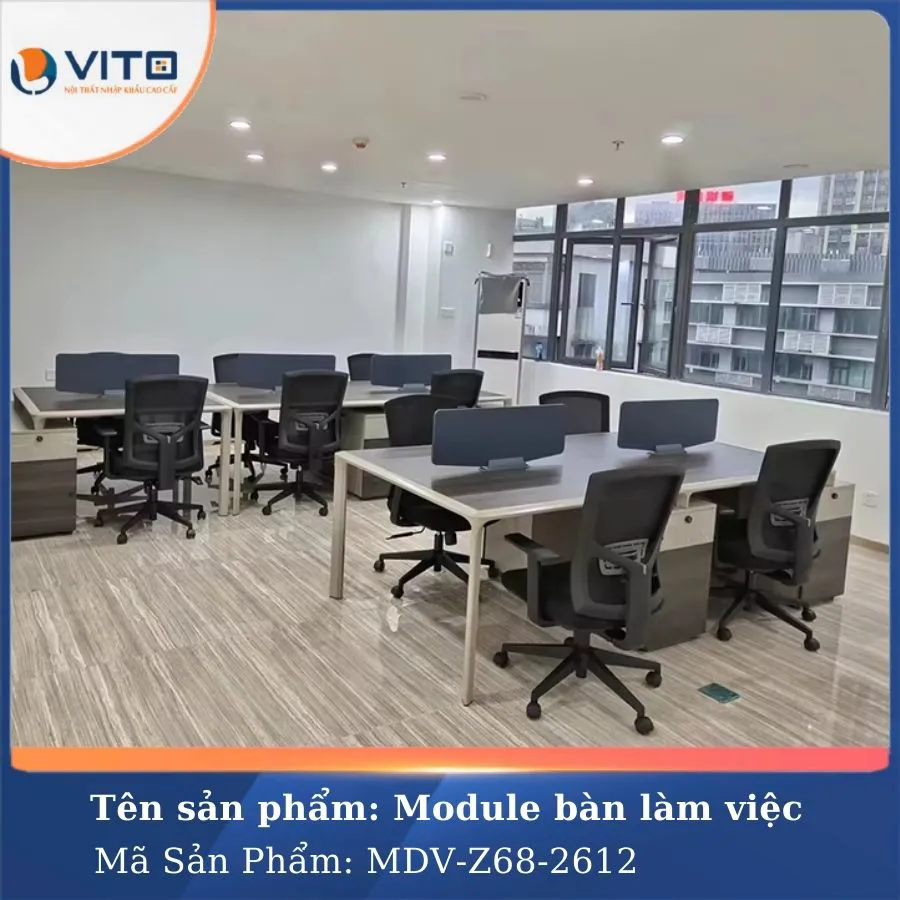 Trong môi trường làm việc hiện đại, việc tối ưu hóa không gian và tạo ra môi trường làm việc thoải mái, chuyên nghiệp luôn là ưu tiên hàng đầu của các doanh nghiệp. Mẫu module bàn làm việc 4 người MDV-Z68-2612 là một trong những lựa chọn lý tưởng cho văn phòng hiện đại, mang đến sự tiện nghi và tính thẩm mỹ cao. Hãy cùng Nội Thất Văn Phòng Vito khám phá ngay mẫu Module bàn làm việc này ngay nhé!