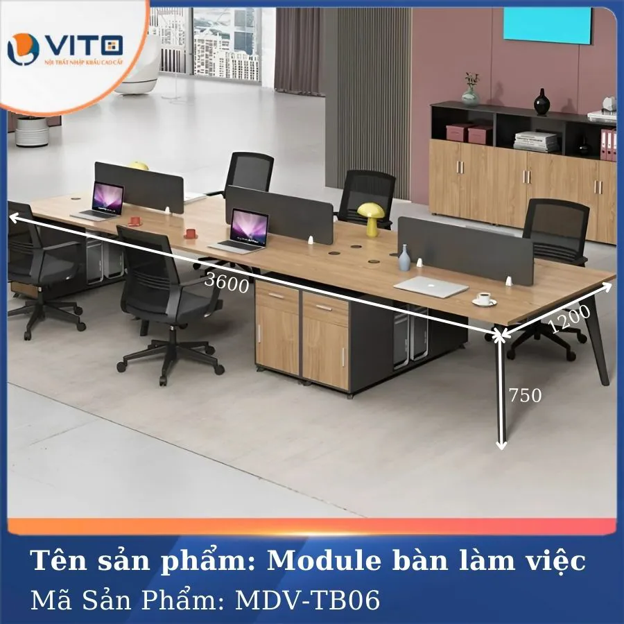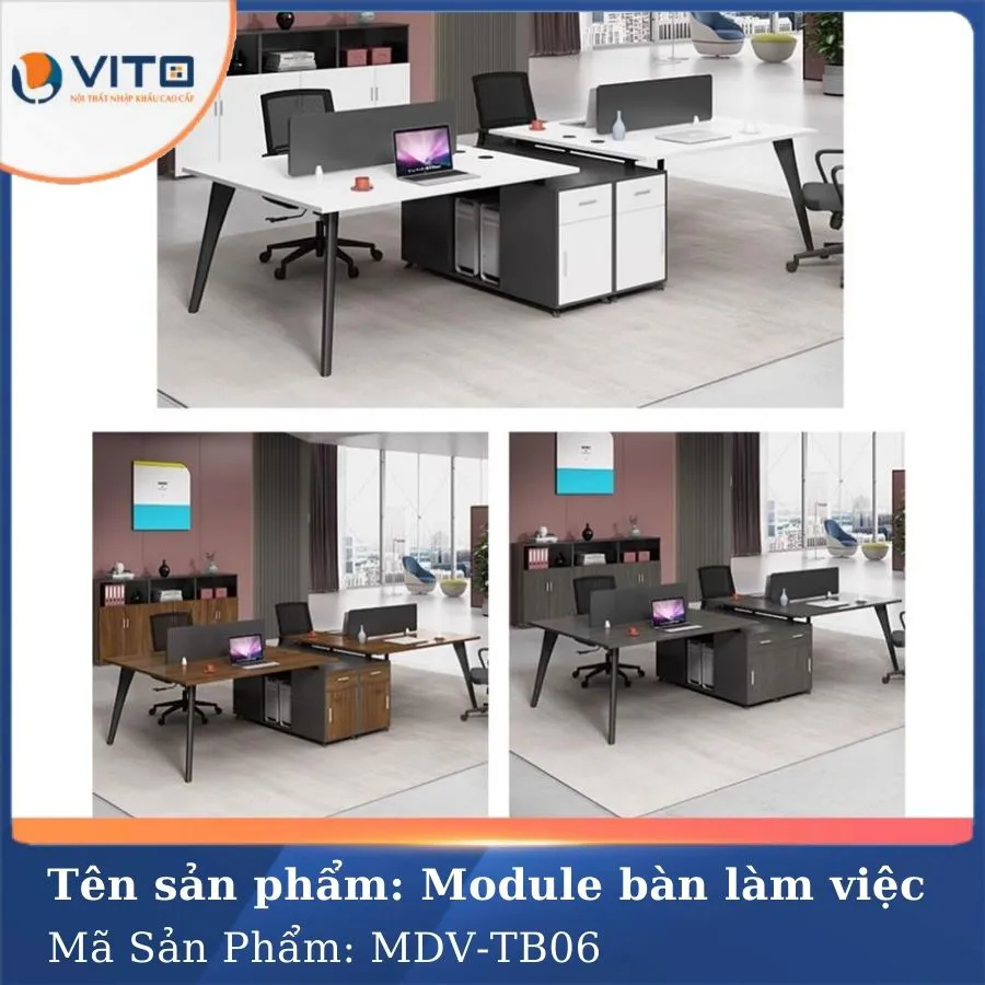 Module bàn làm việc MDV-TB06 không đơn thuần là một chiếc bàn làm việc – đó là sự đầu tư cho trải nghiệm làm việc hiện đại, chuyên nghiệp và hiệu quả. Với kiểu dáng đẹp mắt, tính năng thông minh và độ bền vượt trội, sản phẩm xứng đáng có mặt trong mọi không gian văn phòng đẳng cấp. Đây là lựa chọn lý tưởng để nâng tầm diện mạo và chất lượng làm việc của doanh nghiệp bạn. Hãy liên hệ ngay Vito để sở hữu cho mình những chiếc bàn làm việc hiện đại, chất lượng nhất nhé!