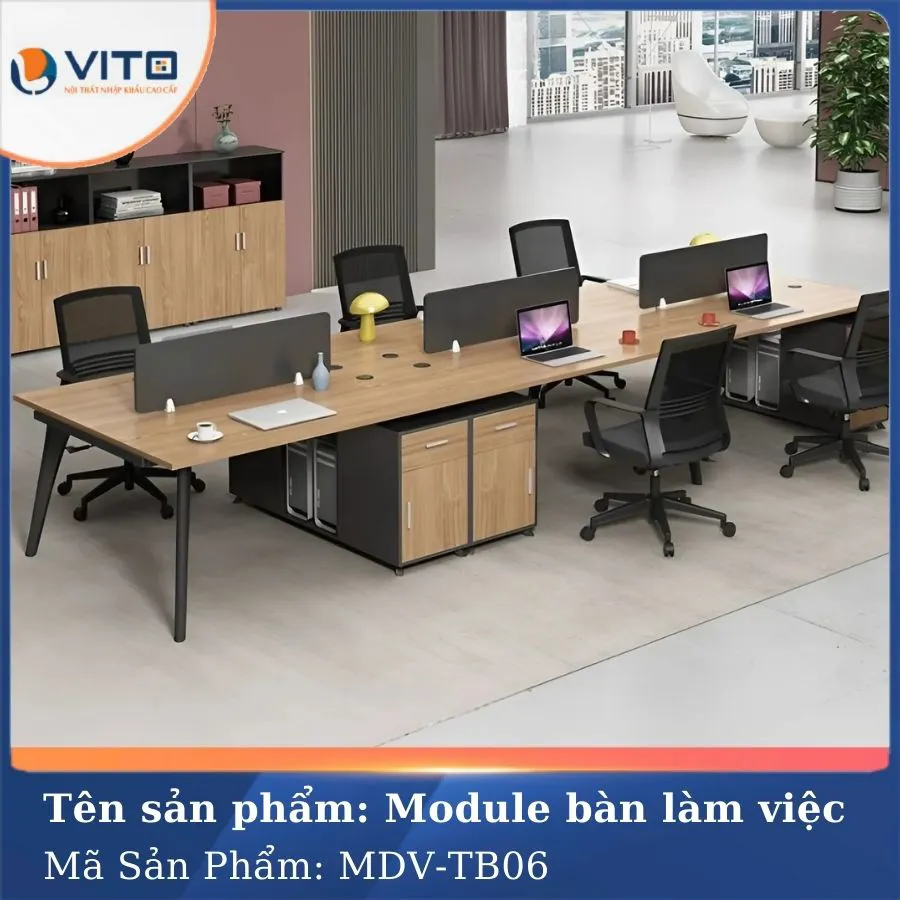 Trong thời đại hiện đại hóa không gian làm việc, thiết kế nội thất văn phòng đang chuyển mình theo hướng tối giản, tinh tế nhưng vẫn đầy đủ tiện ích. Mẫu Module bàn làm việc 6 người MDV-TB06 chính là sự hòa quyện hoàn hảo giữa tính thẩm mỹ cao cấp và công năng vượt trội, mang đến trải nghiệm làm việc chuyên nghiệp, thoải mái và đầy cảm hứng cho người dùng. Đây là sản phẩm nổi bật của thương hiệu VITO – Nội thất nhập khẩu cao cấp, đang được nhiều doanh nghiệp ưa chuộng. Hãy cùng Nội Thất Văn Phòng Vito khám phá chi tiết về sản phẩm này ngay nhé!