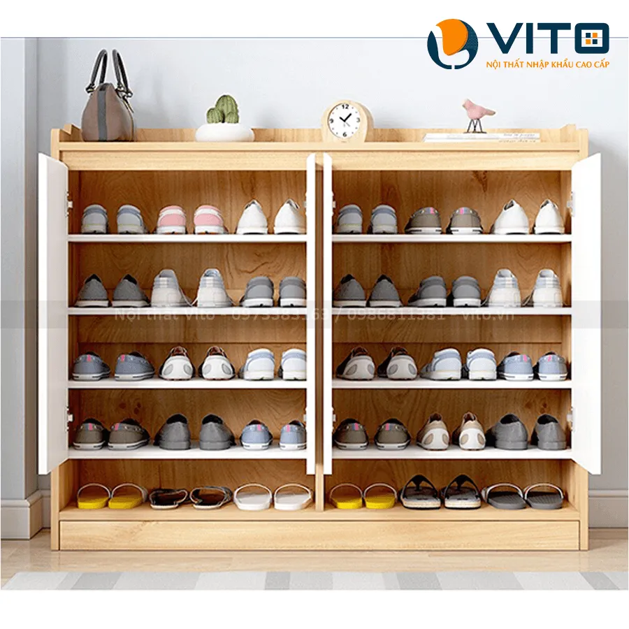 | Kiểu dáng | Tủ được thiết kế chắc chắn cùng nhiều ngăn chia tinh tế giúp bạn sắp xếp giày dép một cách gọn gàng, ngăn nắp. Phần mặt tủ có thể trưng bày đồ trang trí,.. Tủ có chân kê cao cách sàn, hạn chế ẩm mốc, giữ được độ bền lâu dài Cạnh tủ được cắt gọt kỹ càng, gia công tỷ mỉ, đảm bảo tính thẩm mỹ cao |