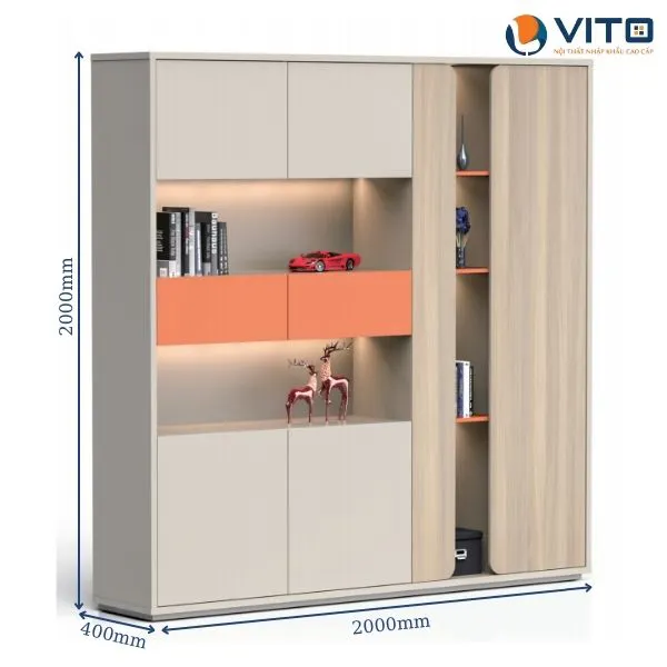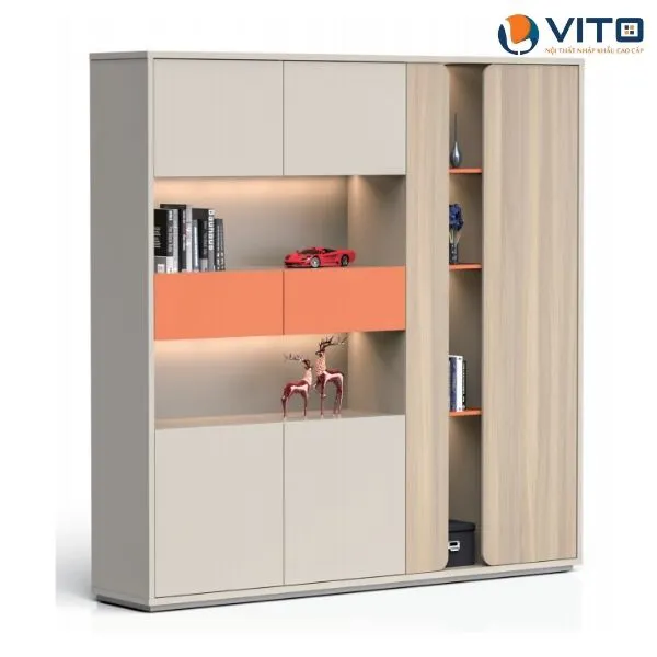Tủ giám đốc Vito TGDV-W-01420 sở hữu thiết kế hiện đại với bố cục tinh tế, kết hợp giữa sự tối giản và nét độc đáo riêng biệt. Tủ được chia thành nhiều khoang lưu trữ, bao gồm các cánh mở kín đáo, ngăn trưng bày có đèn LED trang trí và các ngăn kéo tiện lợi. Thiết kế mặt trước tạo nên sự đối xứng nhã nhặn, kết hợp hài hòa giữa các mảng màu trung tính và sắc cam nổi bật – một điểm nhấn ấn tượng mang đến sức sống và cá tính cho không gian làm việc.