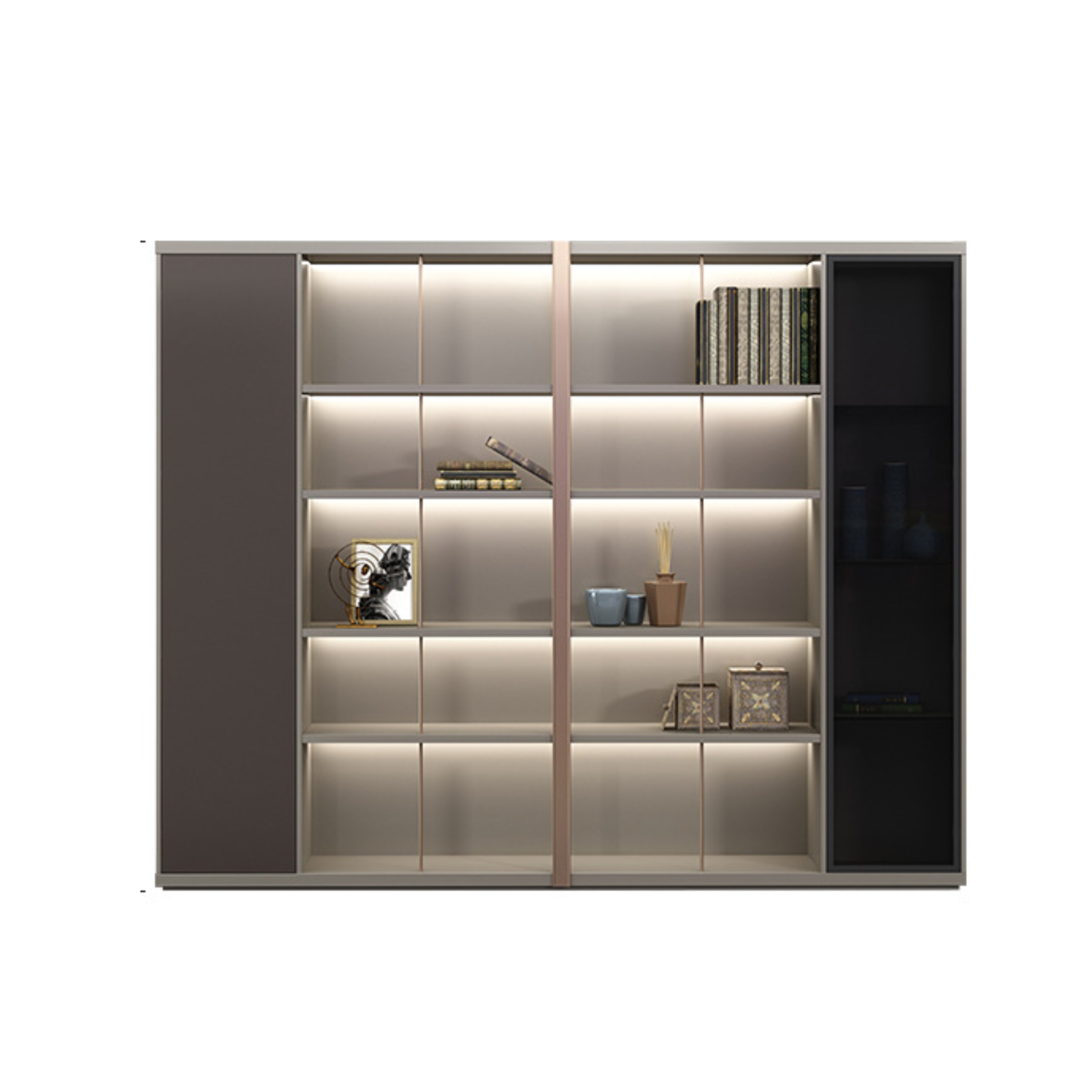 Thiết kế hiện đại, kết hợp giữa tủ trang trí và tủ tài liệu điểm nhấn cho không gian văn phòng lãnh đạo.