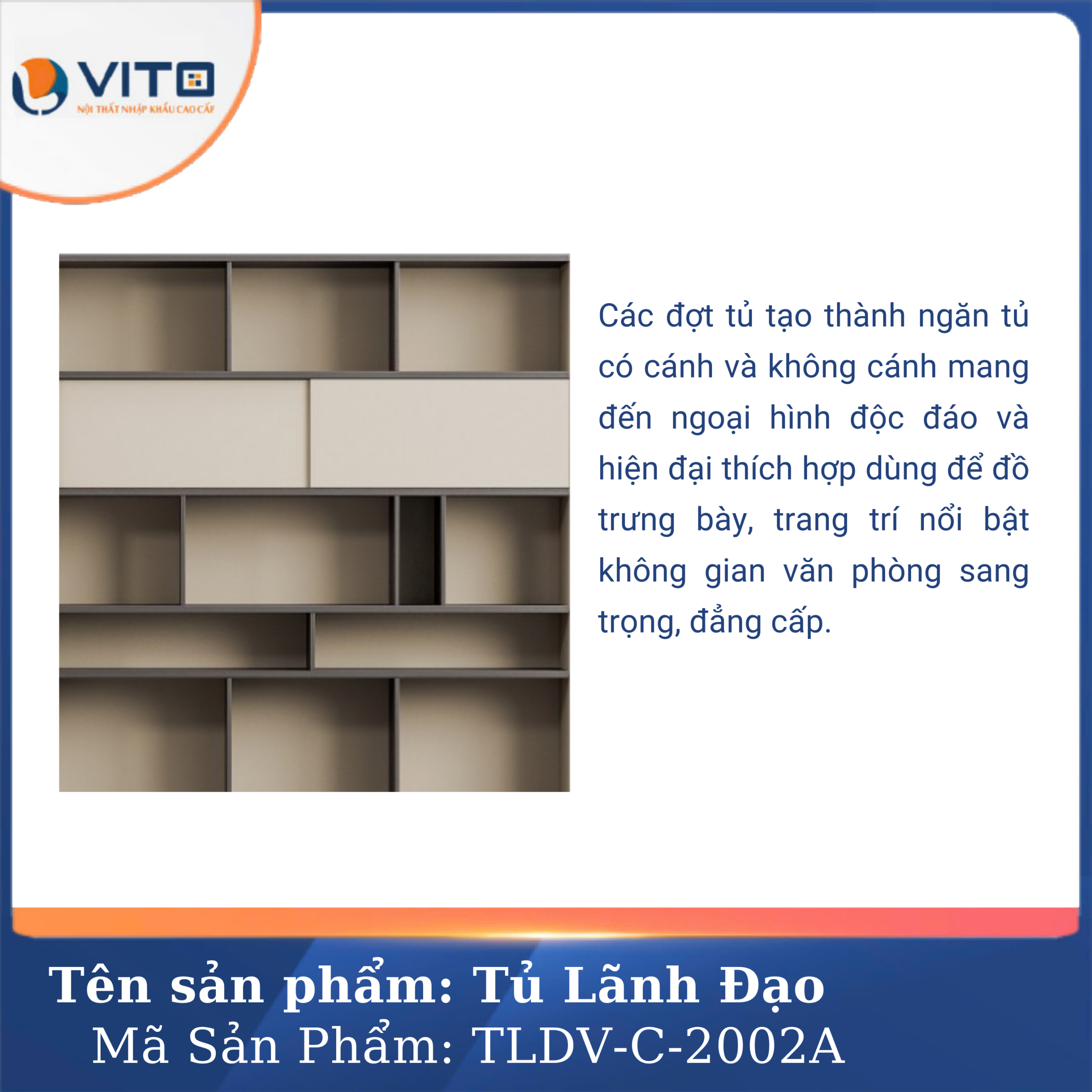 Trong môi trường làm việc hiện đại, tủ tài liệu không chỉ đơn thuần là nơi lưu trữ giấy tờ mà còn là biểu tượng của sự chuyên nghiệp và đẳng cấp. Tủ tài liệu lãnh đạo Vito TLDV-C-2002A thiết kế sang trọng, khẳng định đẳng cấp của người đứng đầu doanh nghiệp. Sản phẩm được nhập khẩu và phân phối chính hãng bởi Vito, kiến tạo không gian phòng lãnh đạo sự tiện nghi, đẳng cấp. Cùng Vito khám phá ngay Tủ tài liệu lãnh đạo Vito TLDV-C-2002A nhé!