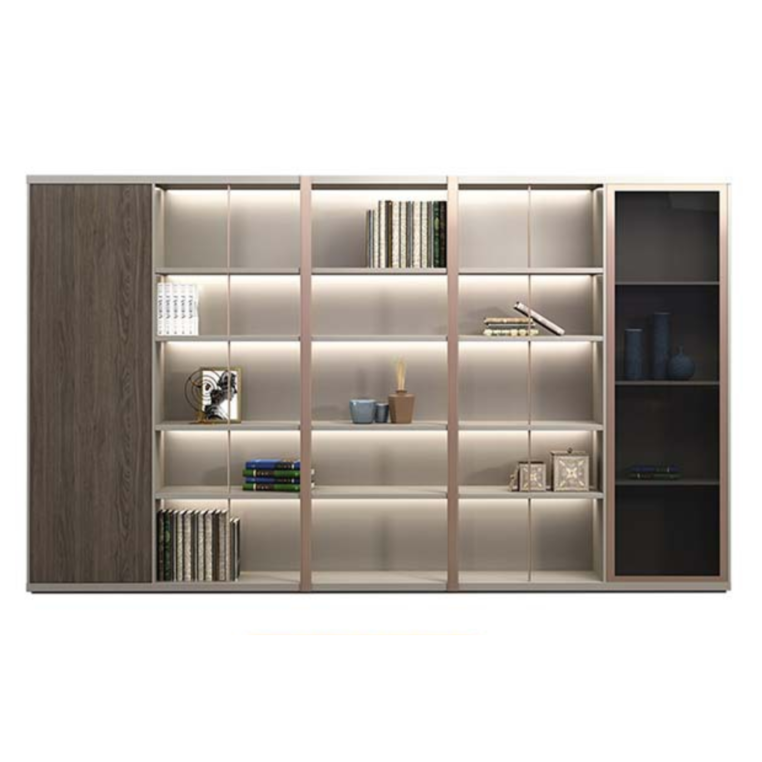 Thiết kế hiện đại, kết hợp giữa tủ trang trí và tủ tài liệu điểm nhấn cho không gian văn phòng lãnh đạo.